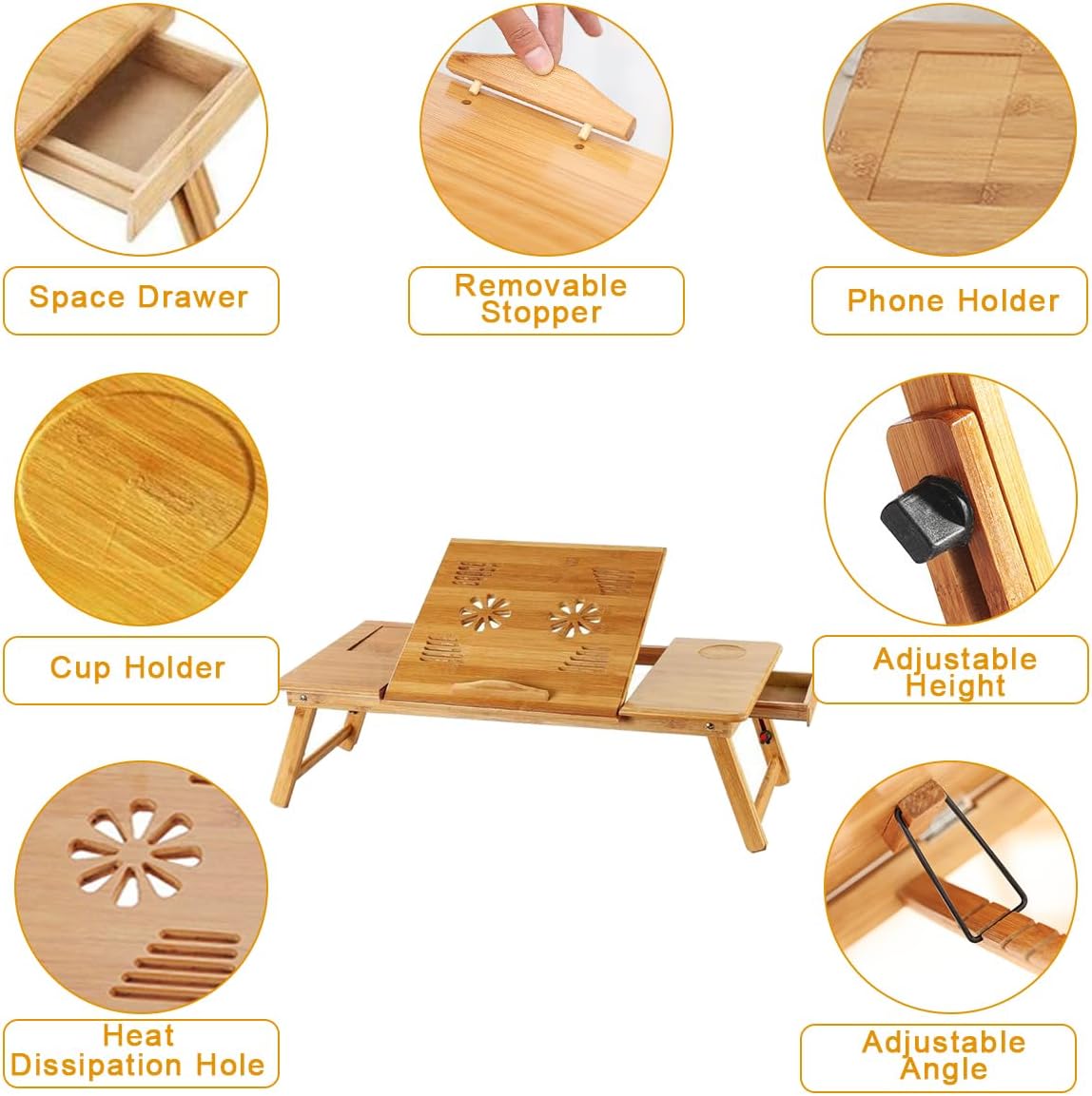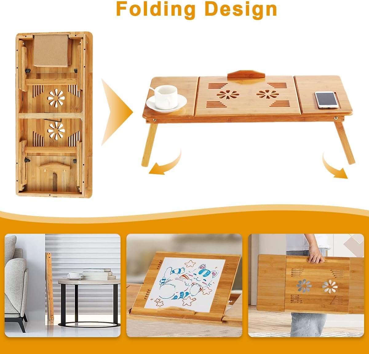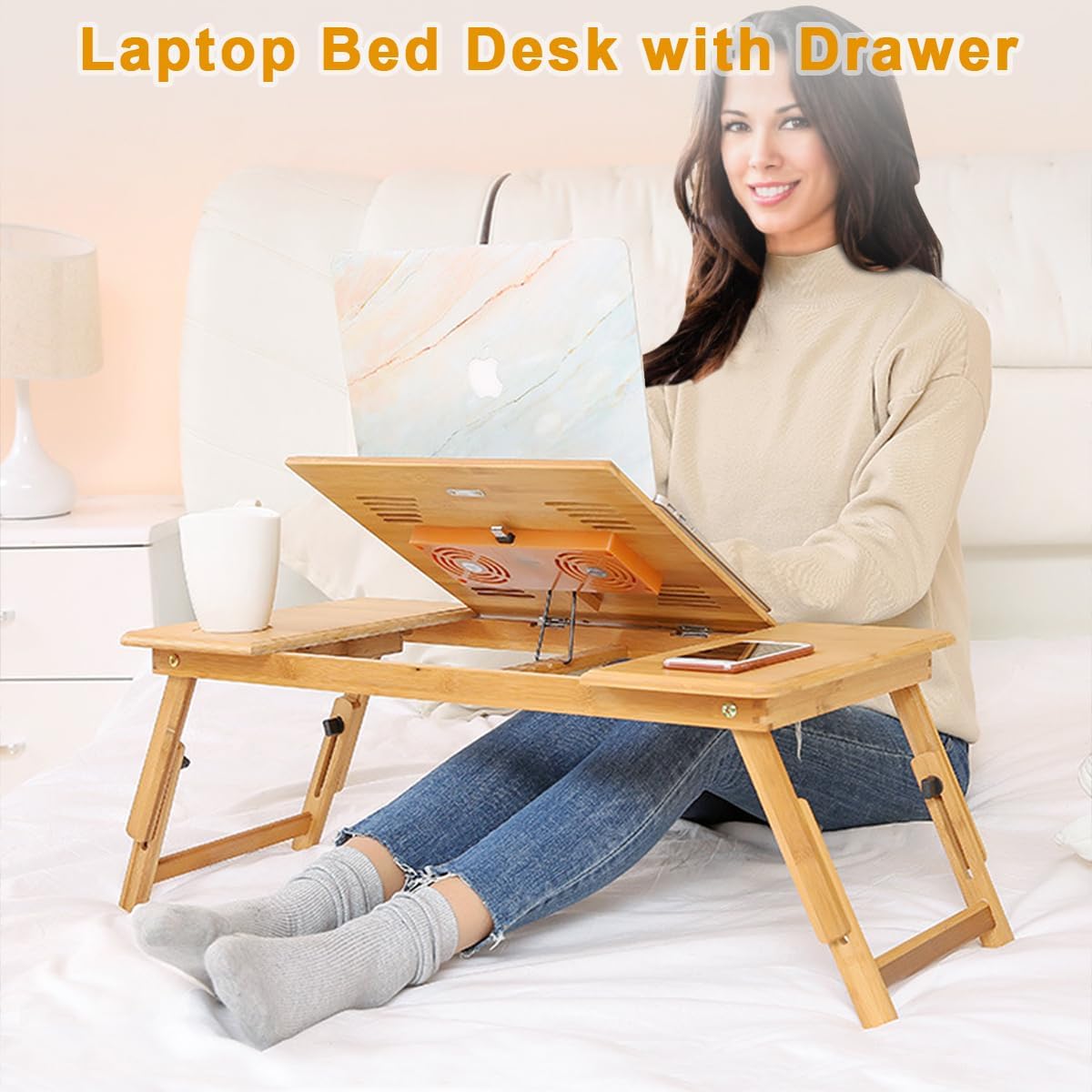 میز لپ تاپ Bamboo Laptop Bed Desk, Lap Bed Tray with Drawer Fan Clooer Portable Foldable Bed Serving Tray Table with Adjustable Tilt Top Phone Cup Holder Notebook PC Bed Stand for Surfing Breakfast Eating Study